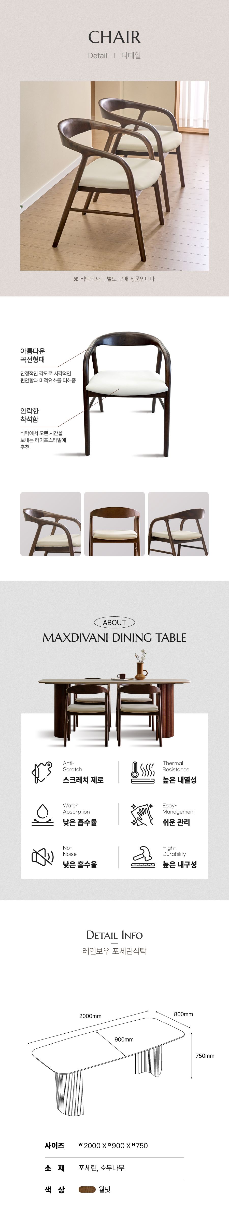 구성 : 2000 X 900(식탁 단품), 2200 X 900(식탁 단품), 의자 별도 구매